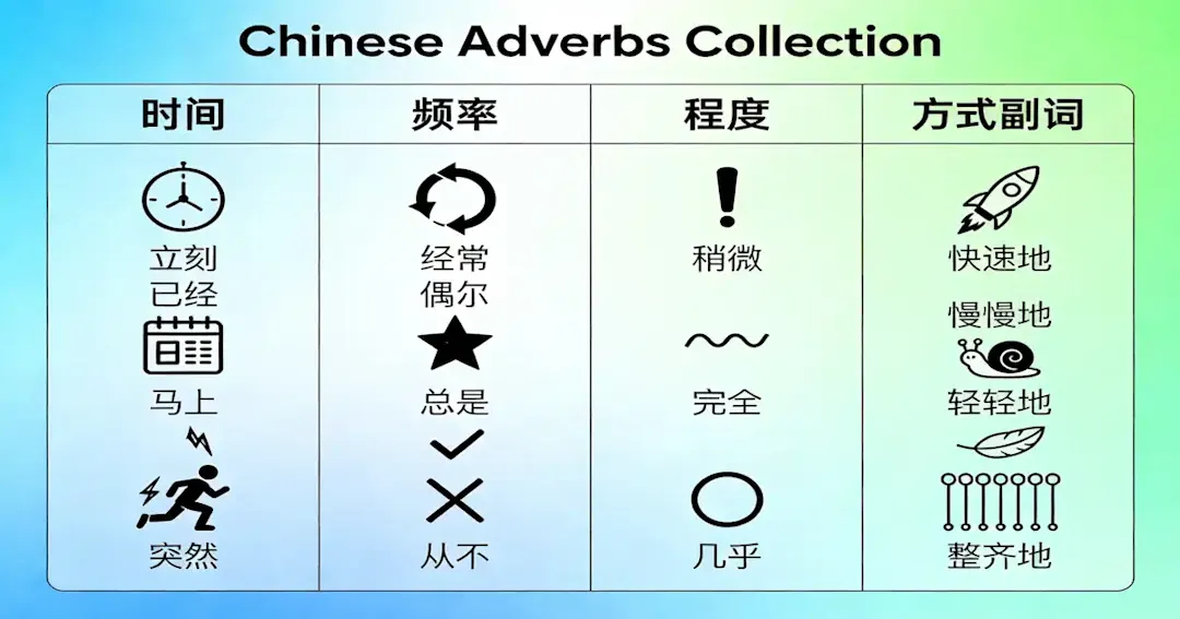 In 2026, kids learning Mandarin don’t just need vocabulary—they need the connectors that make sentences flow. That’s what chinese adverbs do. Time words (现在、已经、还) help kids tell real stories. Frequency words (经常、有时候) help them describe routines. Degree words (真、有点、太…了) help them express feelings without sounding stuck. Manner patterns (慢慢说、认真地写) make speech and writing more precise.