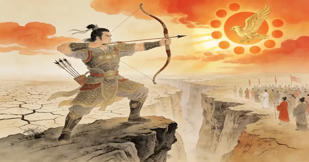 传说里,天上原本有十个太阳,它们按顺序轮流出现,让大地得到光和热。可有一天,十个太阳一起升上天空,热浪像压下来一样,河流干了,庄稼枯了,人们连基本生活都撑不住。这时候,神射手后羿出现了。他拉开弓箭,连续射向天空,最终射下九个太阳,只留下一个。大地重新恢复正常,人们也终于能继续生活。